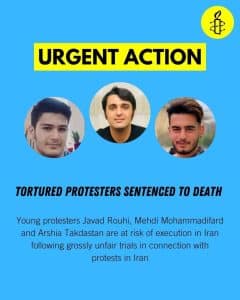سه معترض جوان شکنجه شده با نامهای عرشیاتکدستان ۱۸ ساله، مهدی محمدیفرد ۱۹ ساله و جواد روحی ۳۱ ساله، در معرض خطر اعدام قرار دارند.